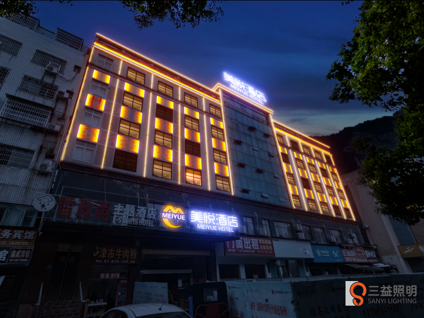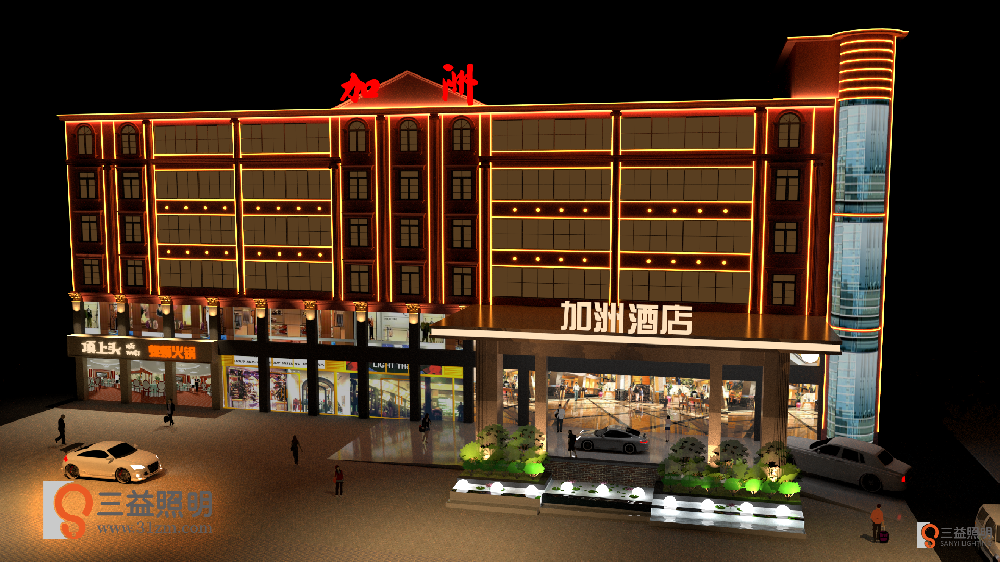 益陽加洲酒店外墻亮化工程設計,本工程設計采用DMX512線條燈、DMX512硅膠燈制作全彩效果。