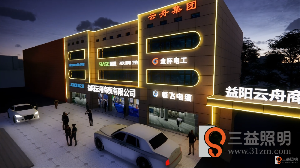 益陽市云舟商貿(mào)公司外墻燈光設計,設計采用LED無縫線條燈,不銹鋼發(fā)光字。